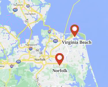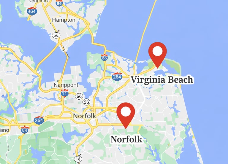 Operamos principalmente en Virginia, con un fuerte enfoque en Virginia Beach, Norfolk, Chesapeake y el área metropolitana de Hampton Roads.